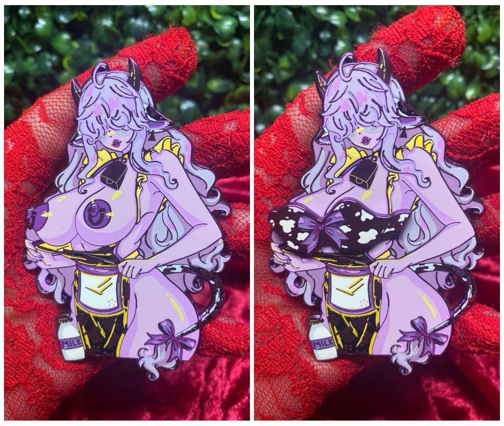 - Comes with a free matching magnetic bra enamel pin that can sit on top of your Milk Maid to cover her if needed. The bra has purple chrome double plating along with purple and white glitter on the bow.