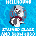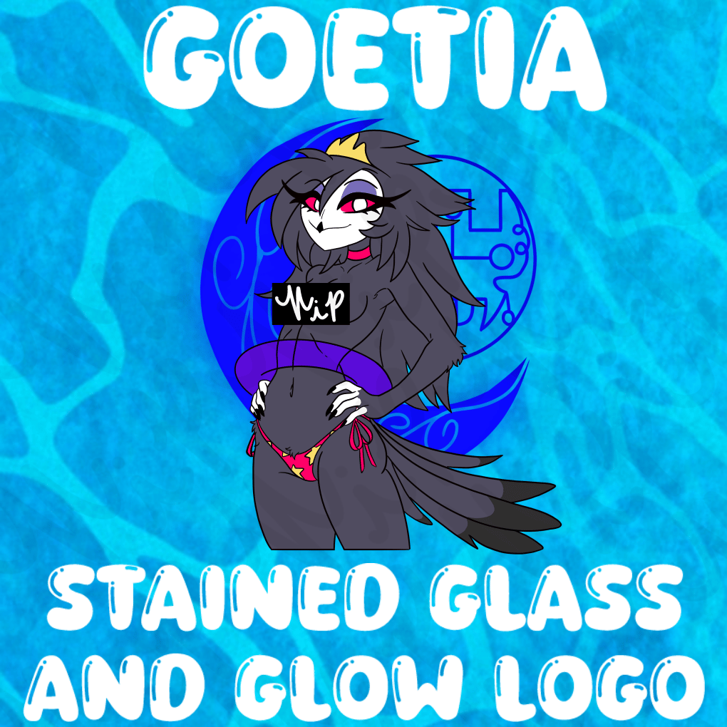 Effects: Clear stained glass background and glow print on IMP (red glow) and grimoire (blue glow) logos, and chunky glitter on both swim tubes; black holographic glitter (Hellhound), and yellow iridescent shift star-shaped glitter (Goetia).
